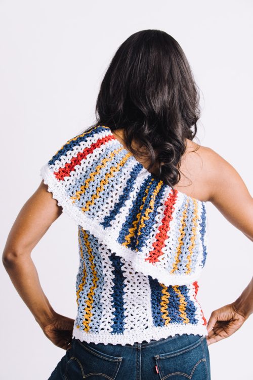 If you are looking for an easy crochet outfit, then you should definitely try this colorful one-shoulder top from Michele Maks. It is available in many sizes, so you can choose your perfect fit.