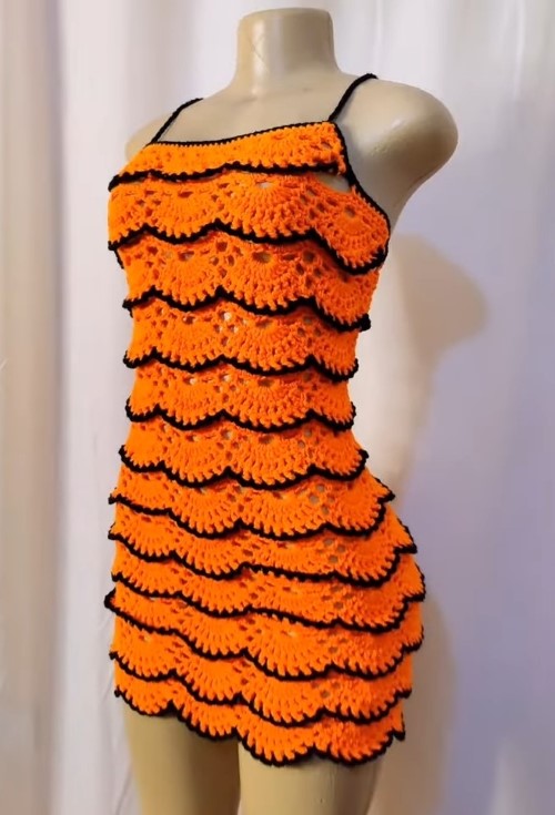 Have a look at this beautiful crocheted mini dress by Ascarcrochets. The outfit looks quite eye-catching with its bold orange-hued shell design and black edges.