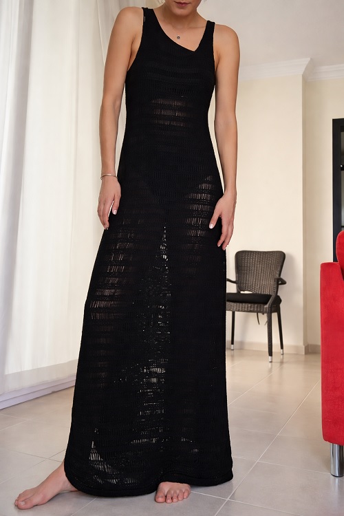 This black maxi dress is worked in rounds, top down, without any seaming. Plus, you will need to use a couple of stitching techniques like ch, sc, dc, inc, dtr, and hdc. For more information, check out JeggoCrochet’s visual guide.