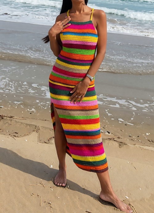 Check out this colorful striped maxi dress pattern with a long side split from POMCLOSET. It’s a perfect crocheted outfit that you should add to your beach wardrobe collection.