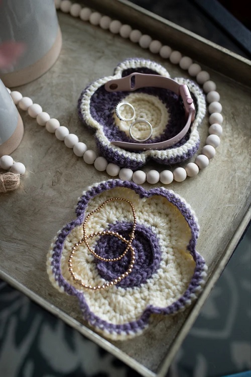 This flower jewelry tray by Lion Brand is a simple, worthwhile crochet project. It features a lovely floral design with ample space to hold rings and necklaces.