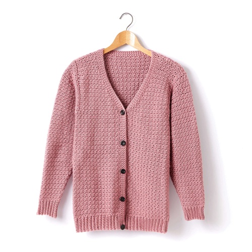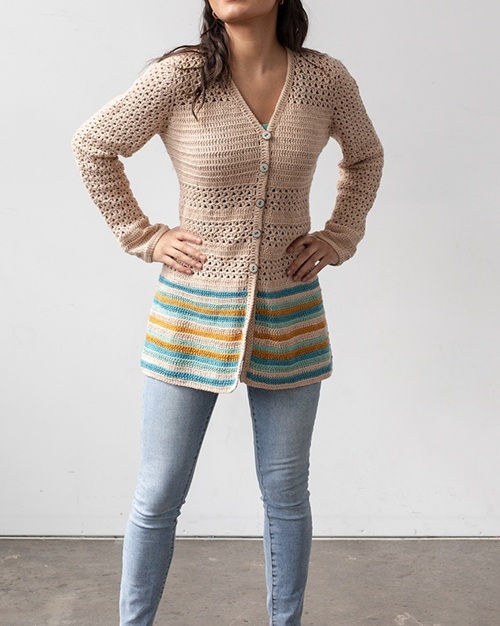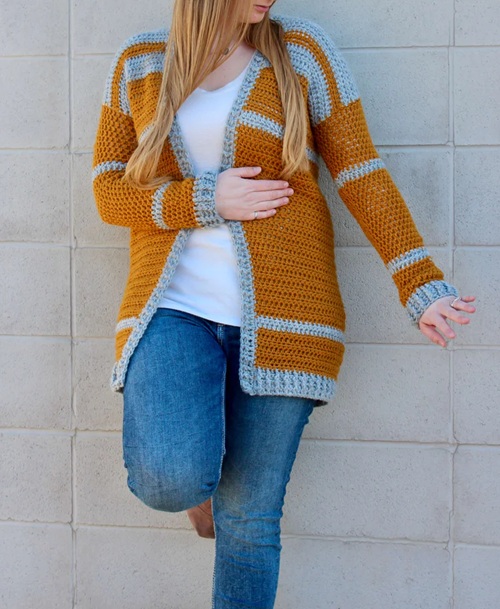 Take a look at this crochet dual-toned cardigan by Lionbrand. It’s crocheted from medium-worsted yarn. The contrasting colors make it more eye-catching.
