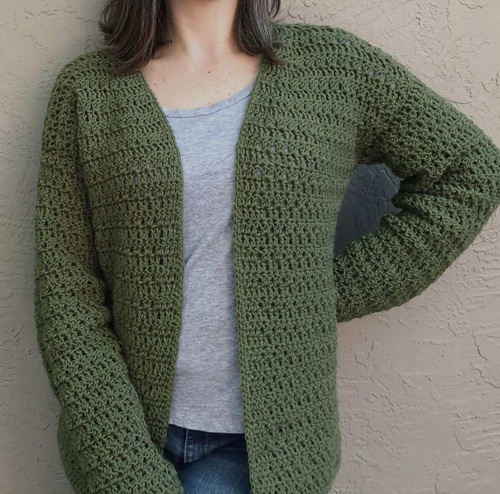 If you are bored with that classic V-neck cardigan, then check this crossover wrap cardigan by Michelle Moore. It is crafted in one piece with a double crochet stitch.