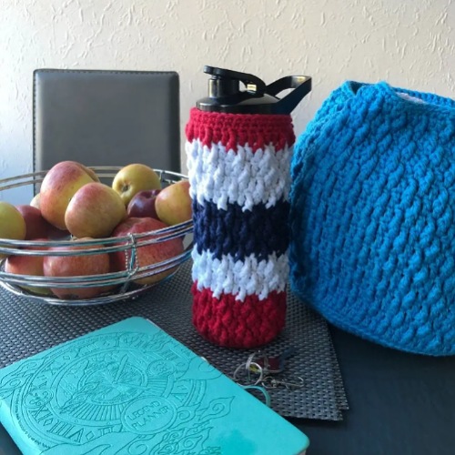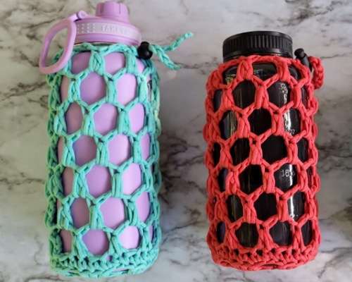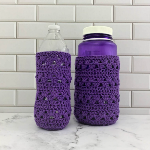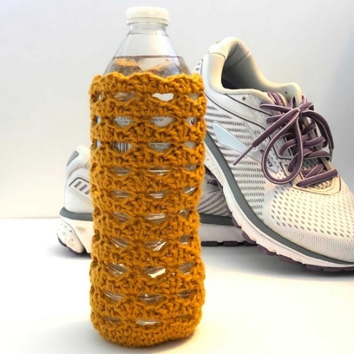 Try this mesh crochet water bottle cozy by Jennifer. It’s super easy to make, thanks to chain, single crochet, double crochet, and half double crochet stitches.