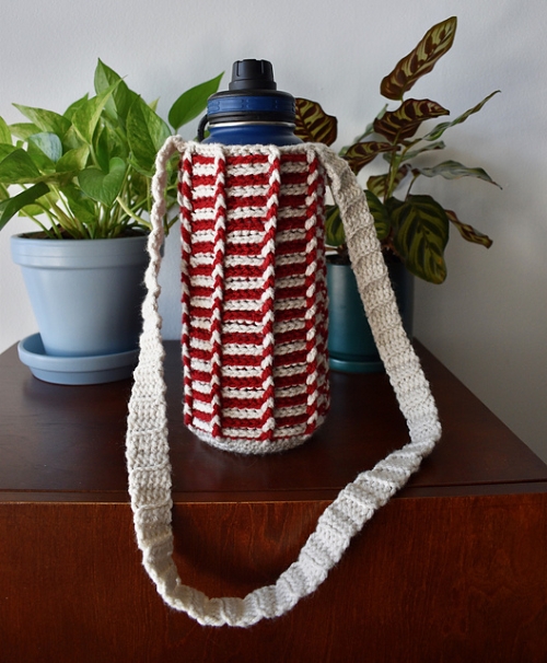 Looking for a no-sew water bottle cozy pattern? This option by Brittany Rene is the best bet. The dual-tone, striped design, and ribbed texture are the major highlights.