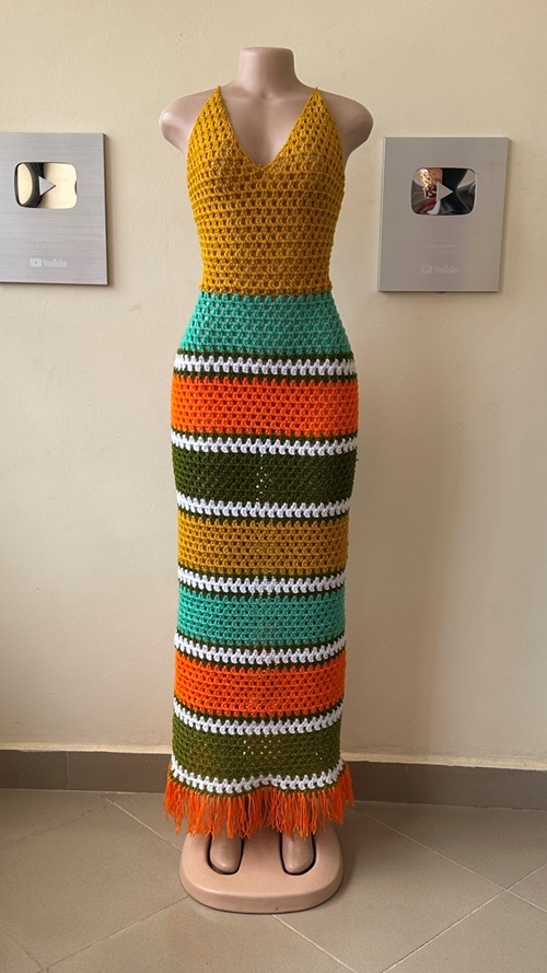 Take a look at this gorgeous granny maxi dress by Shyler Crochets. The colorful stitches and V-neck design with fringed borders are the standout features.