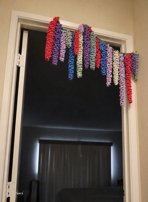 Learn how to crochet this beautiful wisteria garland by Juli Anne. The pattern stands out with its colorful flowers and simple design. You can hang it on the wall or drape it across the mantel.