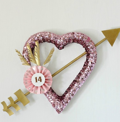 Ornamented with pink sequins, gold glittery feathers, and a paper medallion, this gorgeous cupid’s arrow wreath will attract a lot of eyeballs.