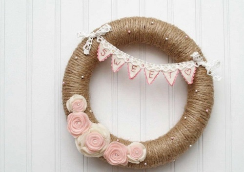Create an eye-catchy display by covering rings with variegated pink yarn to form a heart-shaped wreath. Read details here.