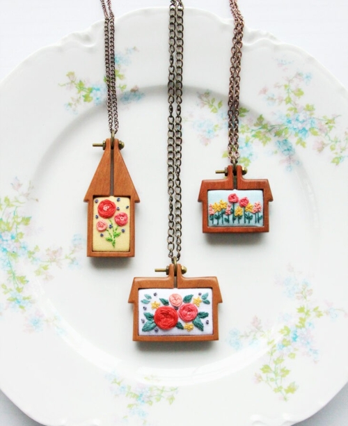 Turn simple embroidery into a meaningful wearable piece of jewelry, just like Flamingotoes did. These patterns feature tiny house motifs, flowers, and a hoop as a base.