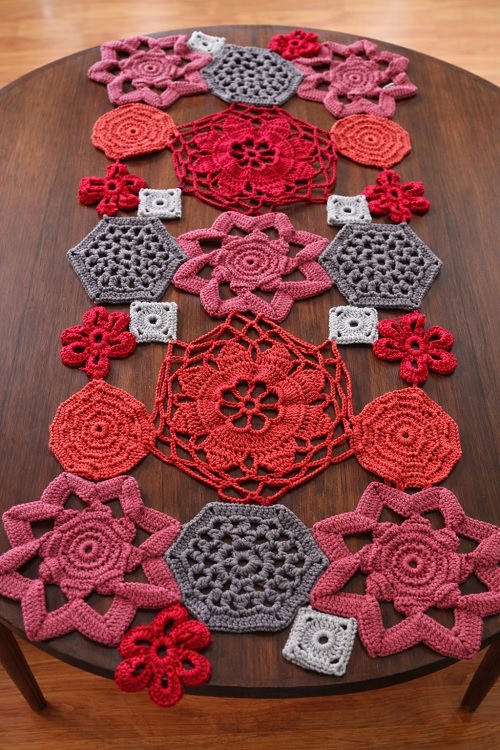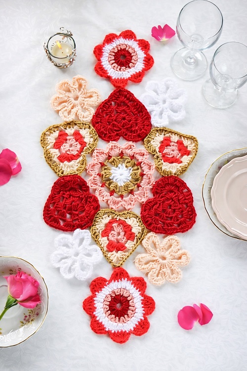 Look at this heart & floral table runner from Sarah Hazell. It has intricate lace-work and colorful floral motifs. You can use this centrepiece during Valentine’s Day and other festive occasions, too.