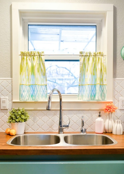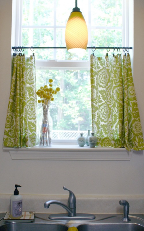 Looking for a quick and inexpensive kitchen window curtain project? This one with a floral print might be for you. Crystal Marin made this accessory with a tension rod, desired fabric, and curtain clip-on rings.
