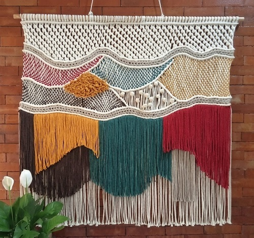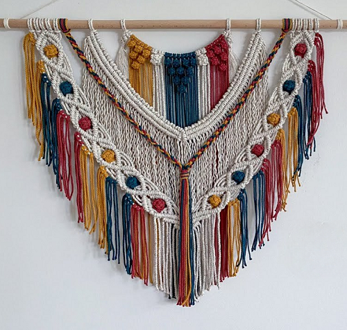Decorate your wall with this lovely macrame hanging that is full of colors. It provides easy-to-follow steps for a fast and happy afternoon project that ends with a high-quality finish. From Macrame Art Jogja.