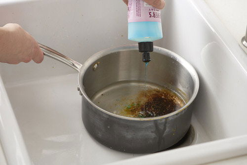 Make your singed cookware brand new again with dishwasher tablets. Start this hack by soaking the pot/pan in hot water for 5-10 minutes. Next, scour the utensilโs surface with a dishwasher tablet to see the difference.