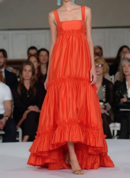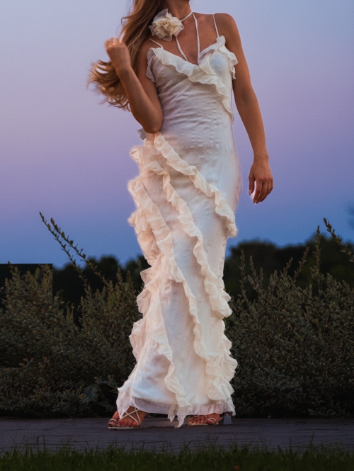 Be the center of attraction at every party with this tiered ruffle gown. WK designer is behind this handmade outfit featuring a double ruffled flounce.