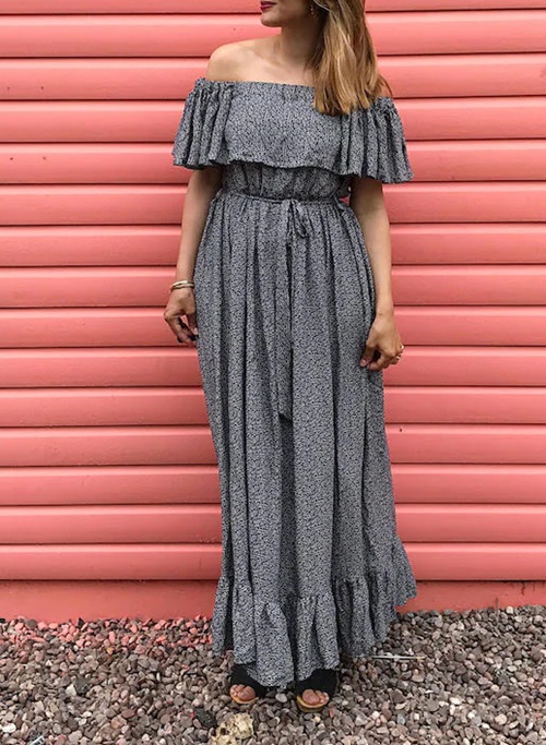 Try this gorgeous long ruffle dress from Elisenne. It is an off-the-shoulder outfit perfect for fall and winter days. Check out!