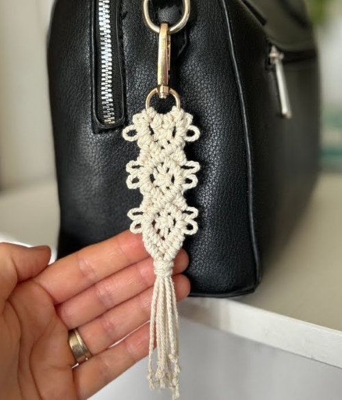 This boho-style bag charm is knotted out of natural cotton cord with a gold-toned key ring. Want to make one? Buy its paid pattern from Resin&Macrame.