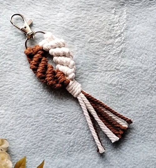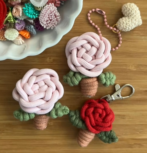 Look at this stunning flower in a pot key charm created by SilentKnot. It uses 3mm or 4mm braided or twisted cotton rope, keyring and masking tape. Watch the video tutorial for more instructions.