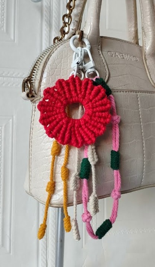 Ready to show off your crafting talent among friends? If yes, take a look at this lovely floral-themed bag charm by Nana Ukhana. It’s made up of double half hitch, wrapped, diamond, barrel and leaf stitches.