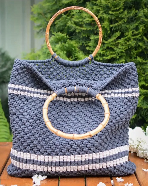 The white stripes and wooden handles are the key highlights of this handmade beach tote bag. Blueicrafts uses larks’ head, square, and double half-hitch knots to create this accessory.