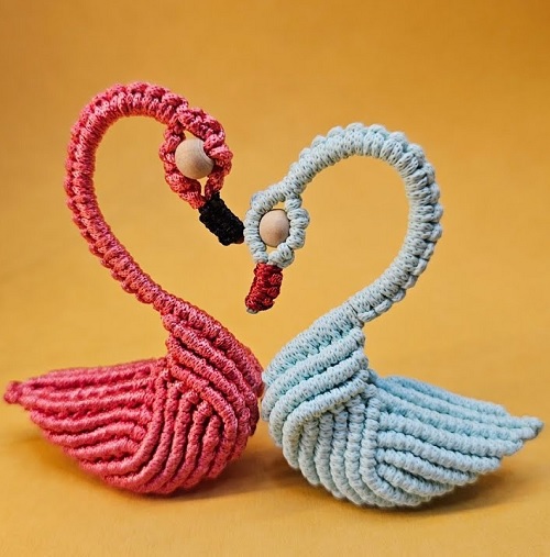 Want to make this lovely swan couple that creates a heart with their heads? Check out KnotJustCrafts now! They are made from 3mm single-strand macrame cord, wooden beads, scissors, and measuring tape.
