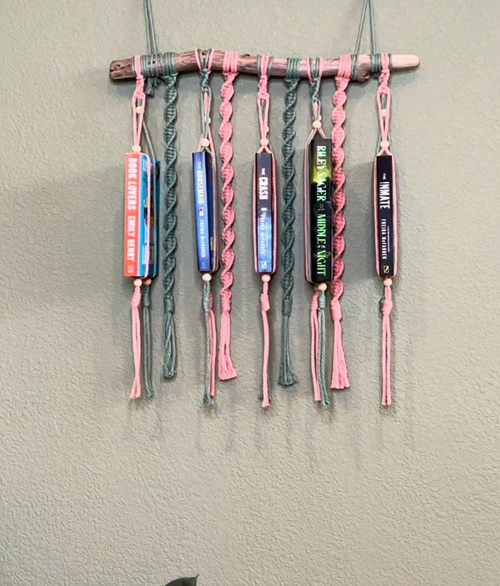 Try this vibrant book display piece available at Etsy. It’s made from wooden beads, basic knots, a wooden stick, and colorful cords.