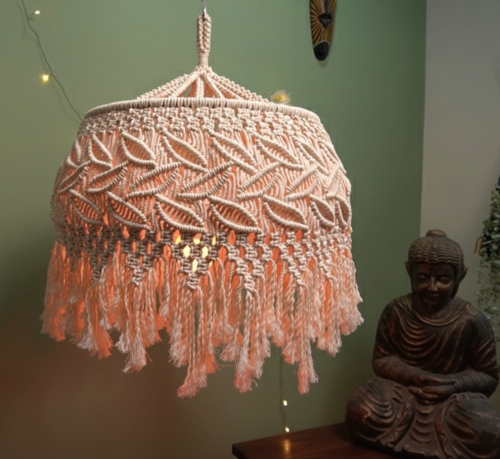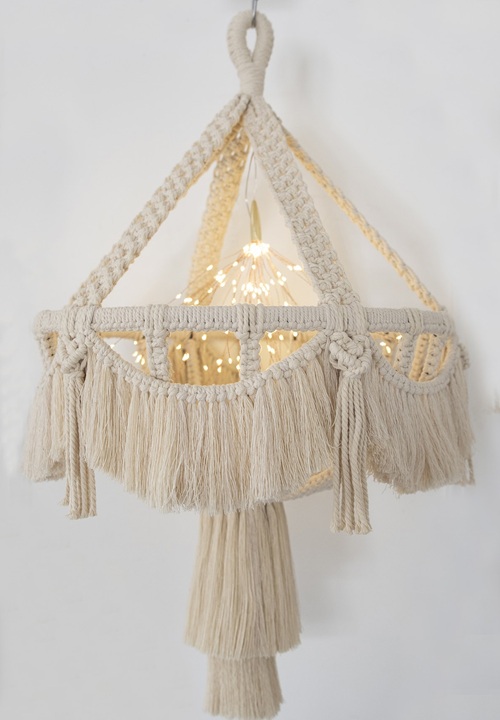 Sasha MACRAMESSAGE is the one behind this white boho-style chandelier. The intricate craftsmanship is truly breathtaking. It’s a must-have piece in your collection.