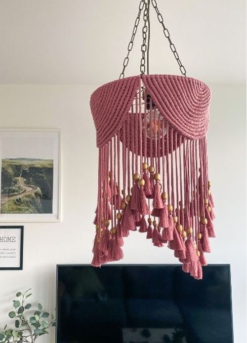 Uzliky has knotted this stunning chandelier with attention to detail. The combination of deep pink color, gold beads, and tassels is quite mesmerizing.
