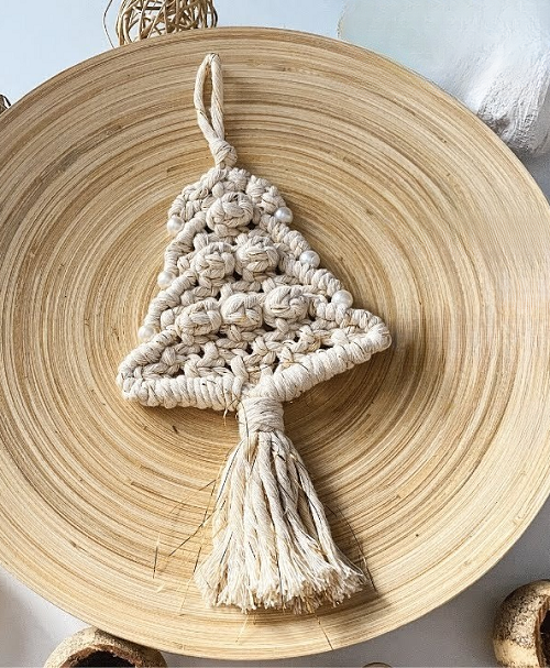 You can easily convert a simple bauble into a Christmas ornament with this adorable design by TheGreenMadHouse. You only need the lark’s head knot and the square knot for this.