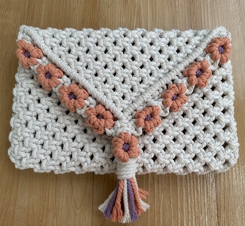 An elegant bag by Macrame with Lilly. It has a beautiful floral pattern that makes the whole bag look like it is covered in handmade blossoms.