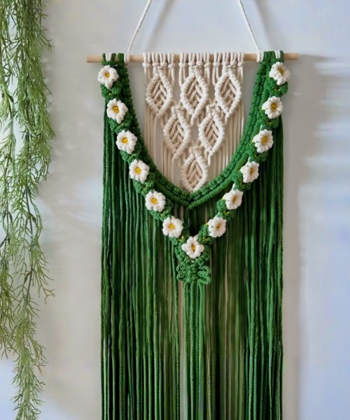 Have a look at this beautiful macrame daisy wall hanging by Silent Knot. It features a diamond motif at the top and a daisy design on the side.