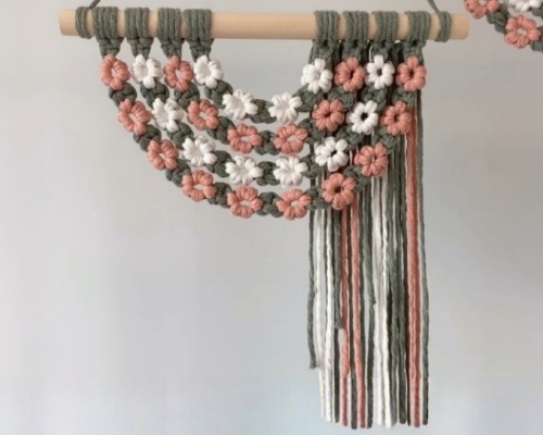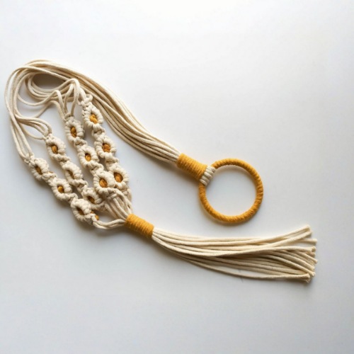 Instead of a plain hanger, try out this unique daisy-themed one by The Knot Place. To make this, you’ll need a square, a half hitch, a double half hitch, and gathering knots.