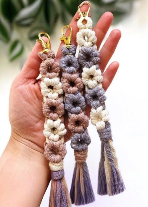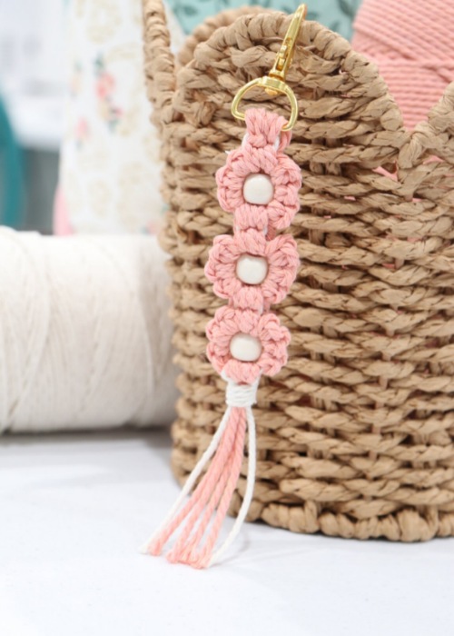 Create a unique keychain with a 2mm macrame cord just like Amylattacreations. It’s an eye-catching accessory featuring the classic daisy flower shape and wooden beads.