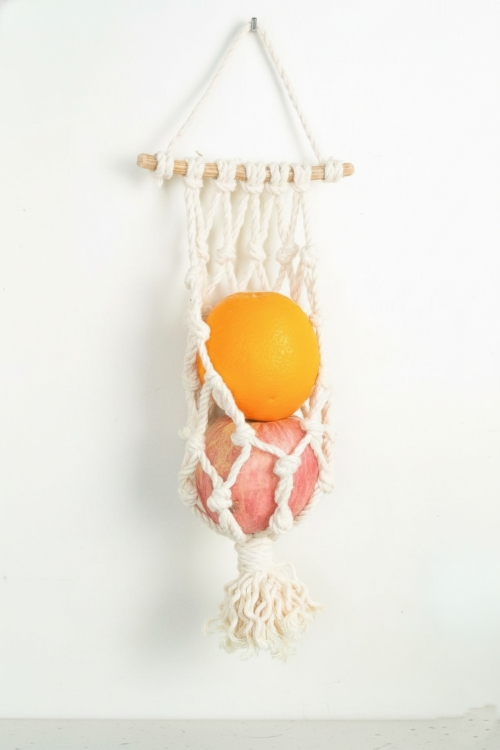 Do you have a limited storage area in your kitchen? Save counter space by storing fruits on the wall with this hanging hammock. Amber Oliver made it with a neutral shade cord and some basic knowledge of stitches.