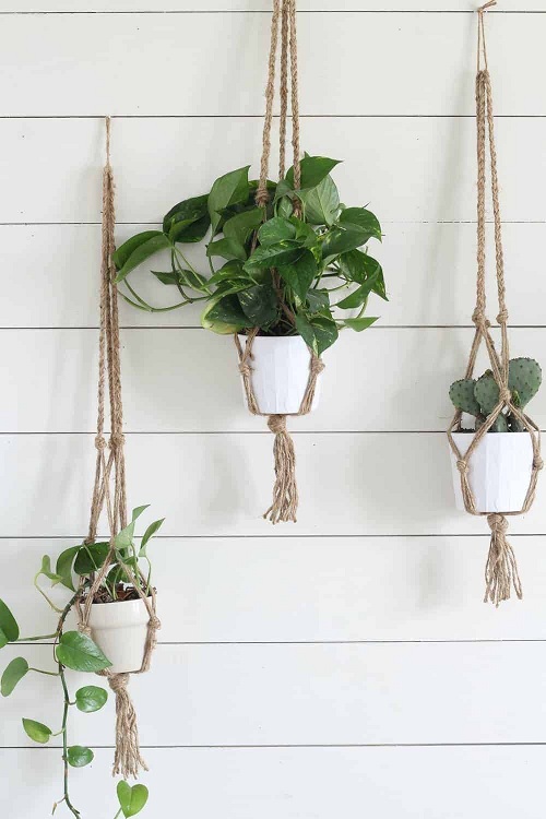Want a super quick plant holder project? Check out this fantastic 10-minute option from Charlotte Smith. To make, you need a cotton clothes line, scissors, pots, plants, and hooks.Â