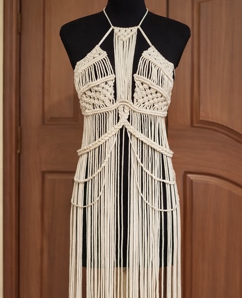 Make this lovely long pregnancy gown created by Summer Macrame. You can use any color of cords to match your vibes. Watch the YouTube tutorial for more information.Â