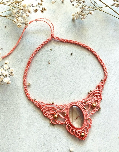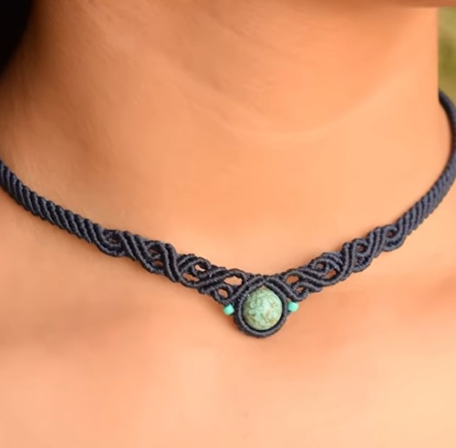 Look at this pretty knotted necklace that you can wear at any party or event. It uses materials like waxed thread, cabochon stone, and brass beads. Go through the video tutorial by Malka Macrame to know the steps.