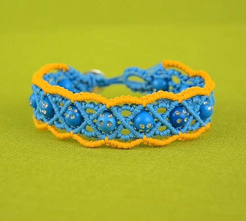 Find the easy steps to create this beaded bracelet at Macrame School’s visual guide. Here, the creator uses 0.5 mm waxed polyester cord, a button, 8 mm beads, and some minimal supplies.