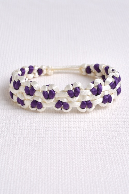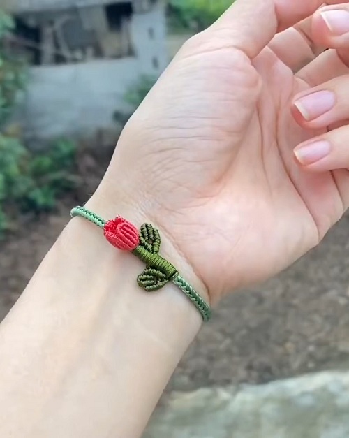 Look at this pretty tulip macrame bracelet designed by handwork-kd. It is a very cute project that turns simple, colorful strings into tiny blooming flowers.