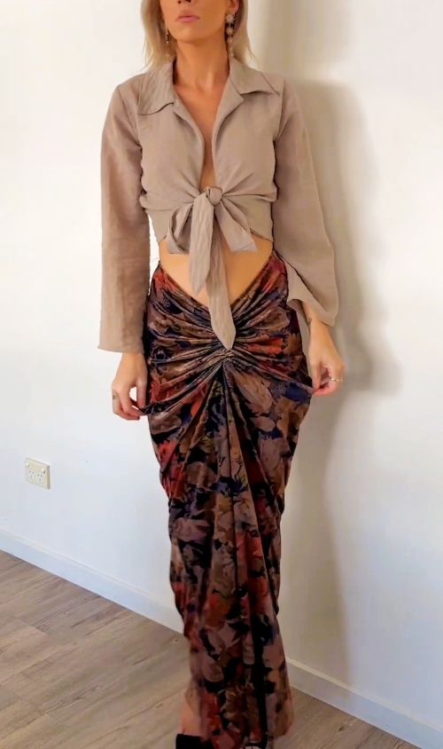 Start your sewing journey with this long, elegant skirt from Natsabb. The creator uses Lycra knit fabric with a beautiful sheen for a mesmerizing appeal.