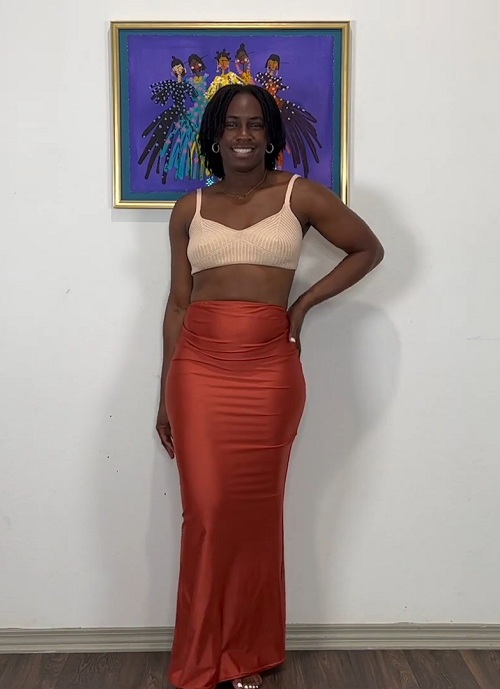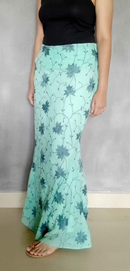 This beautiful, figure-hugging mermaid skirt is created by Sarina Tariq. The skirt’s bottom flair is made with the godet-sew technique.
