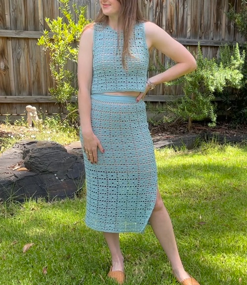 Try this gorgeous pencil skirt designed by AC Crochets. It uses materials like a 3 mm hook, medium-weight yarn size 3, a stitch marker, and a tape measure. You can change the color to match your vibes.