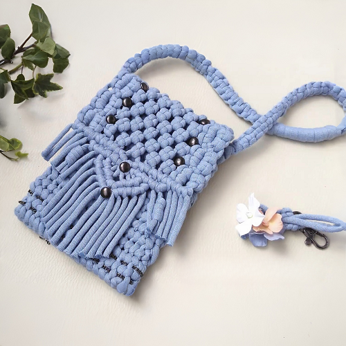Check out this handmade macrame bag by ZIZ Craft. All you need to use is a double half hitch knot, a Chinese crown knot, a square knot, and a reverse double half hitch knot to make this.