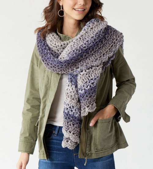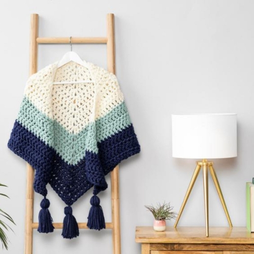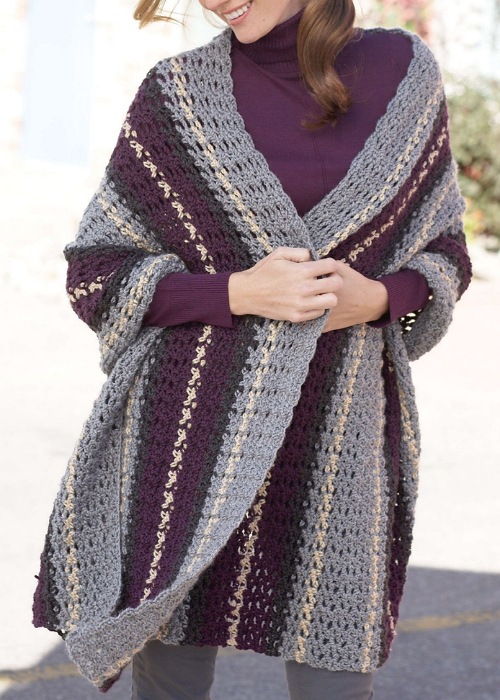 This oversized shawl from Yarnspirations is perfect for afternoon winter parties. Its large size allows for beautiful drape and various styling options.