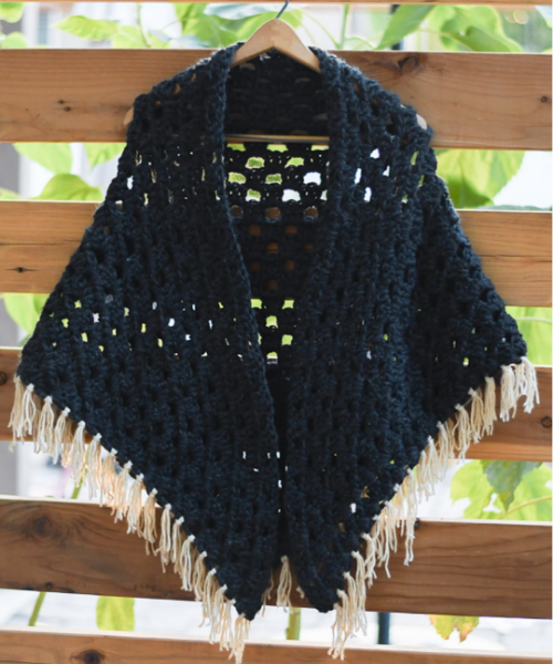 Take a look at this intricately stitched, bulky shawl from Michelle. You only need to know the double crochet stitch, bulky yarn, and a 10mm hook. It has a beautiful color combination and fringes.