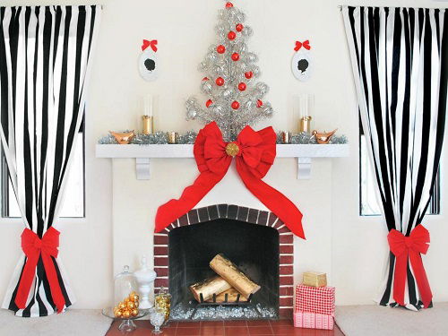 Holidays are all about tradition, this festive season adds retro styling to your living room decor using tinsel, red bows, gold spray-painted wood logs, and Christmas balls to celebrate the holiday joy.