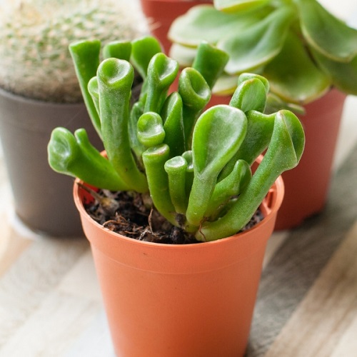 Resembling the famous character Shrek’s ears and ET’s fingers, this succulent has elongated, tubular green foliage. It’s a cultivar of Crassula ovata that is also known as ‘Skinny Fingers.’