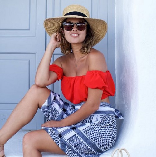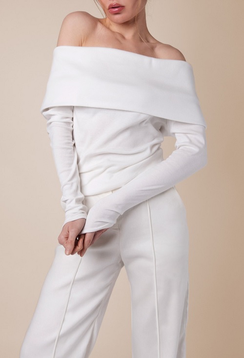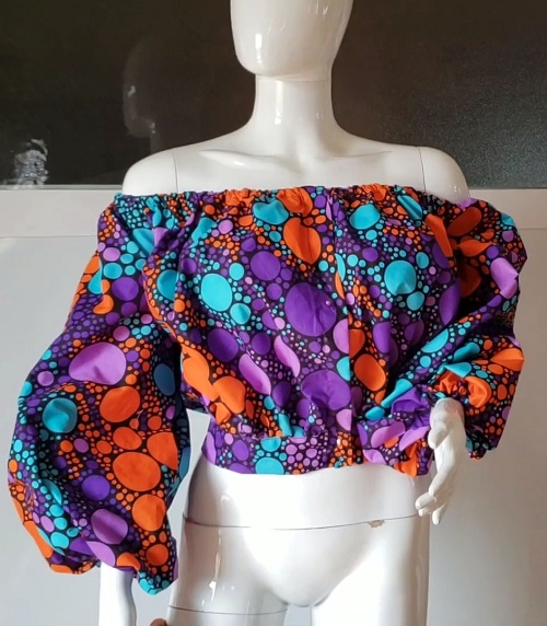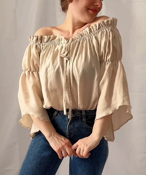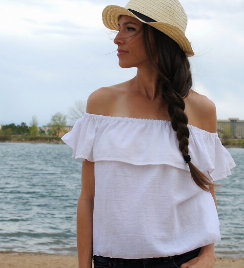 Try making this off shoulder crop top by Geneva Vanderzeil. You can easily throw it on yourself. It pairs nicely with high-waisted jeans, skirts, or shorts.