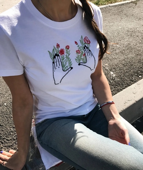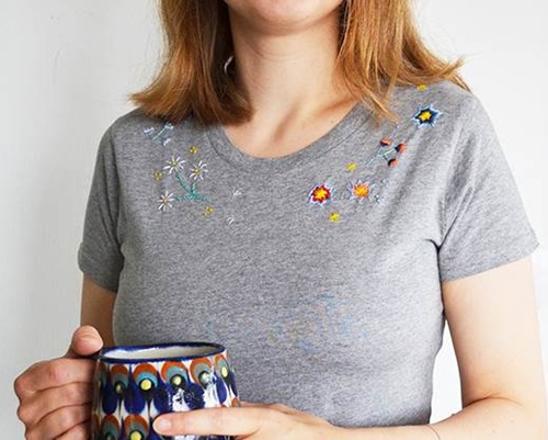 Have a look at this hand-embroidered t-shirt by Cutesycrafts. All you need is to use embroidery floss, a hoop, and a needle. Check out!