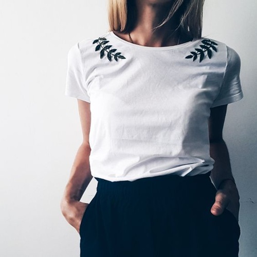 Take a look at this beginner-friendly embroidery T-shirt by Let’s Explore! The intricate leaves on both the shoulders are just quite visually appealing.